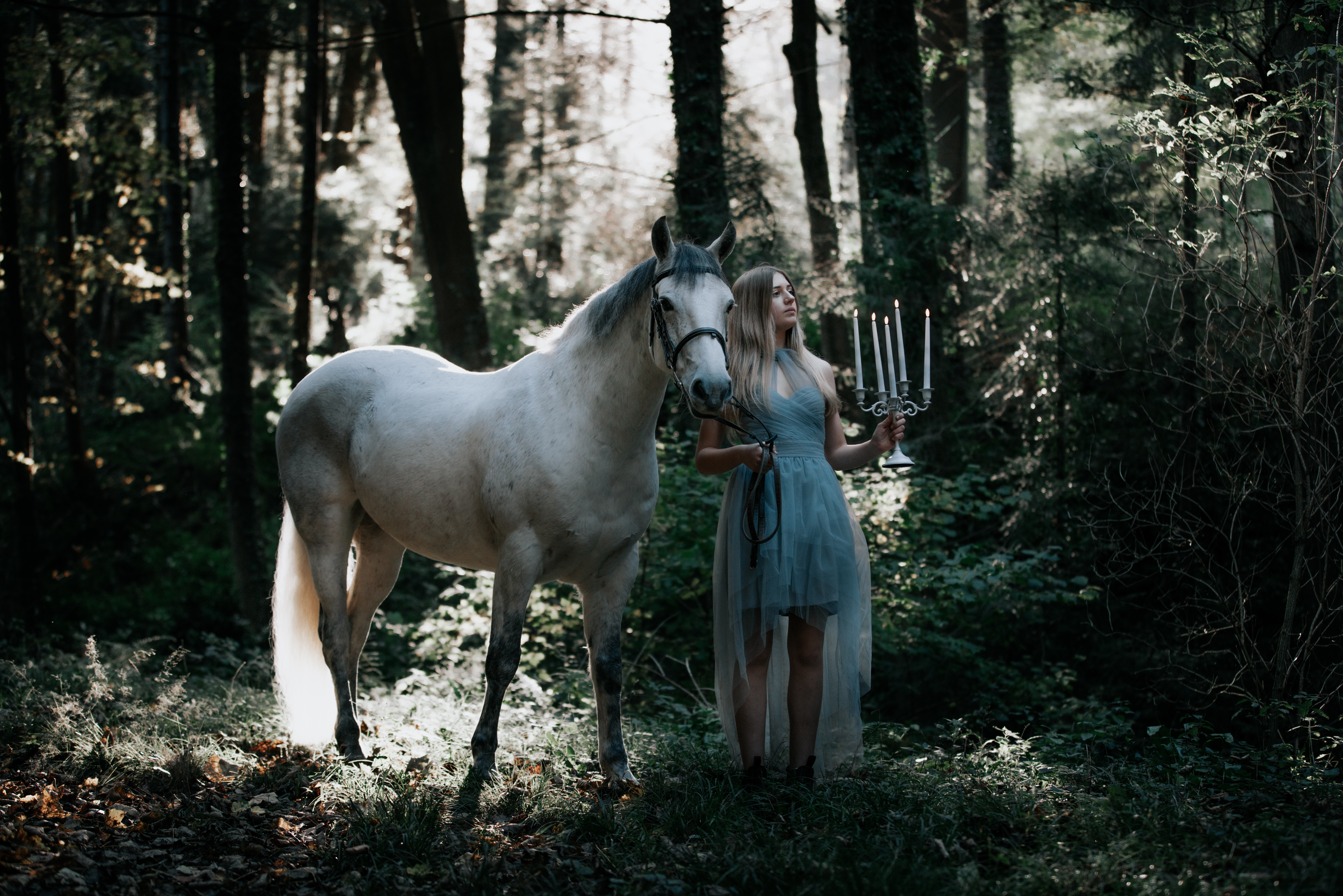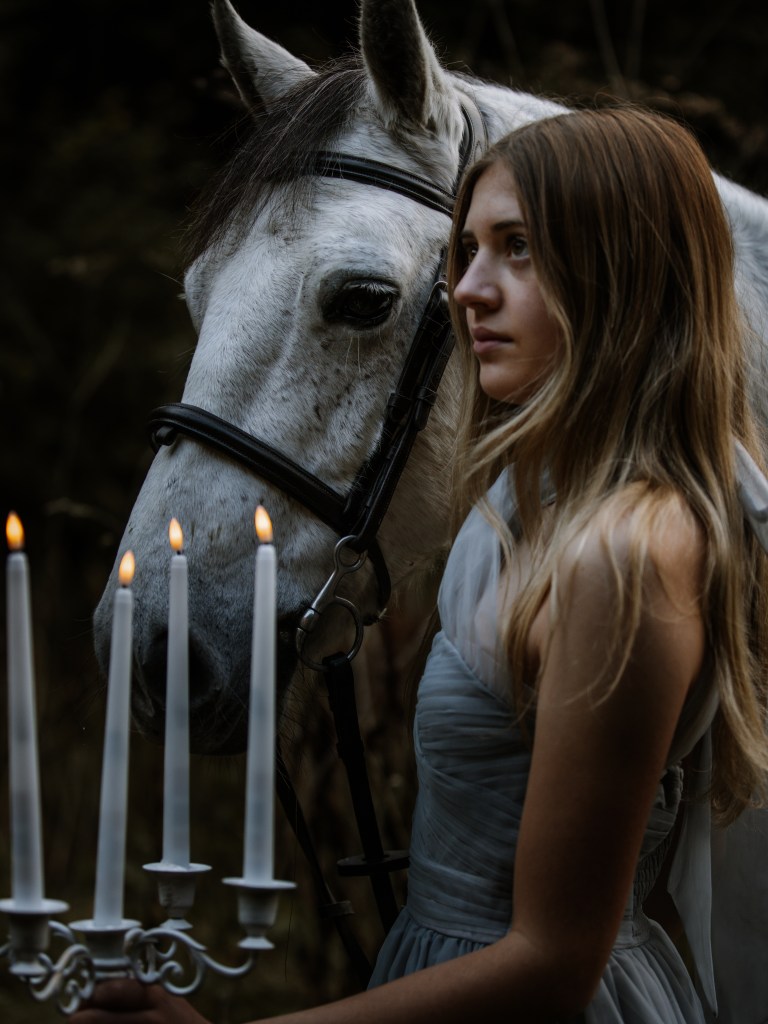 For the past 5 years, every Halloween, I have planned a creative project, to capture the season. In 2020 – the story of a witch and her black stallion – in 2021 the ghost bride and her white horse who roam the grounds of an old castle – in 2022 I delved into old myths and legend at a stone circle and in 2023 the woman in black. This year, the storyline follows the ghost of a girl, lost in the forest with her horse & only the light of a candle to guide her way.